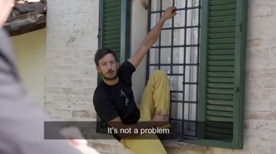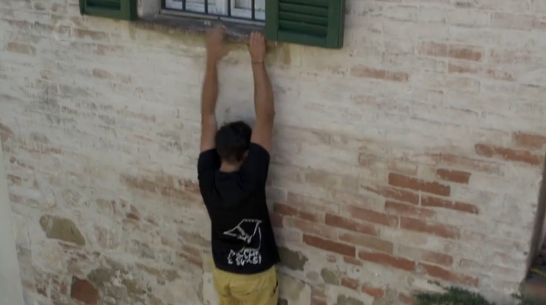 In the images above and below, you can see the climber using the rungs on the lower window like a ladder to reach Filomena's window. Note how the climber's shoes leave no marks on the wall after walking across the ground below.