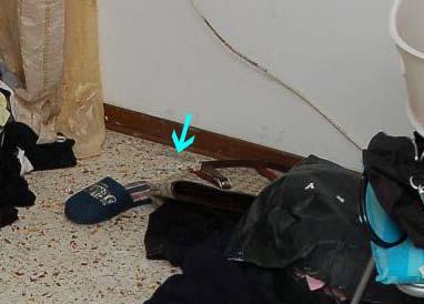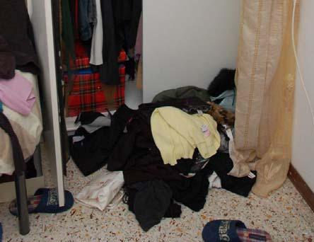 The photo below shows a bundle of clothing items on floor next to wardrobe closet. Note the pair of houseshoes.