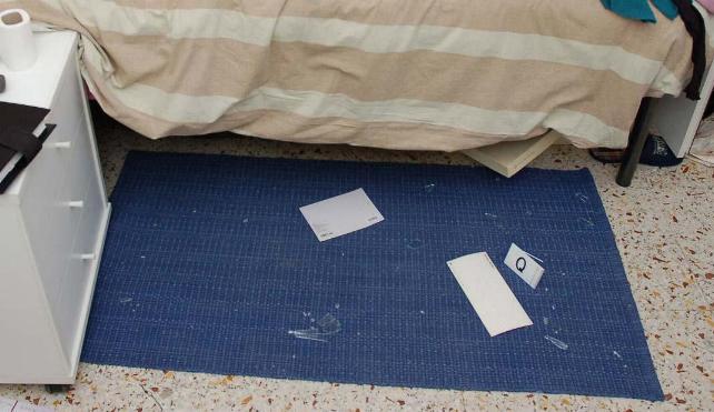 The photo below is a video still showing sunlight reflections of the widely scattered glass fragments on the floor from the desk wall to the bed.