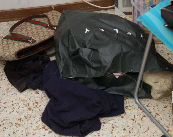 The photo below shows a closeup of the overturned black paper sack of belongings with the rock sticking halfway out. Note the dark sweater under the black paper sack. Note the light colored handbag between the wall and the black paper sack and note the black carrying bag under the handbag.