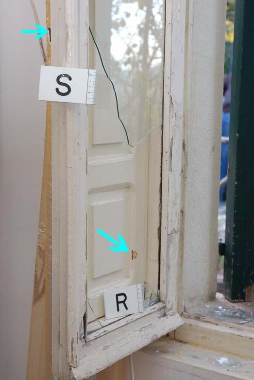 The photo below shows the broken window pane which was the left pane from the inside of the room looking out. Almost half of the nearly four foot high pane was broken out. The bottom arrow locates a recent impact site to the separable inside solid wood shutter. In order to unlock the casement windows, an intruder’s hands would need to be able to extend through the broken out pane and reach the latch at the receptacle shown at the upper arrow about 2 inches above the “S” marker.