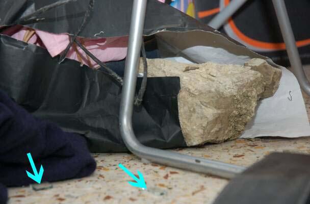 The photo below shows a close-up of the large rock and torn black paper bag. Small flakes of the rock were observed where the rock hit the floor. Also note the two small pieces of glass lying on the floor at the arrows.