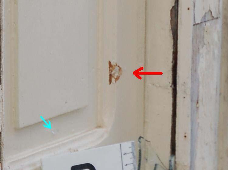The red arrow points to a fresh appearing impact site at a corner edge of the inside solid wood shutter. Crushed or powdered glass appears embedded in this small impact site. Note the crush deformation line behind this impact site. The blue arrow points to a small piece of glass stuck to the inside shutter.