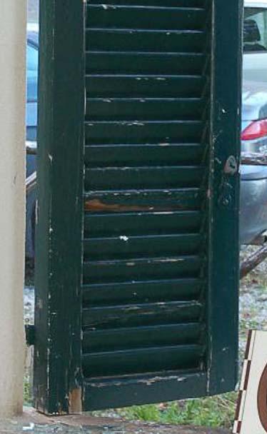 The photo below shows a Close-up of the lower half of the outer window shutter opposite the broken window pane. A portion of the eighth shutter from the bottom appears damaged and without paint covering. A small area of the lower left was also without paint. No embedded or stuck glass shards can be seen in the shutter nor were any reported.