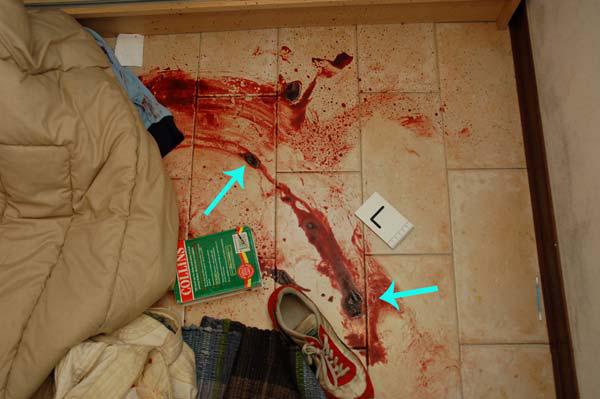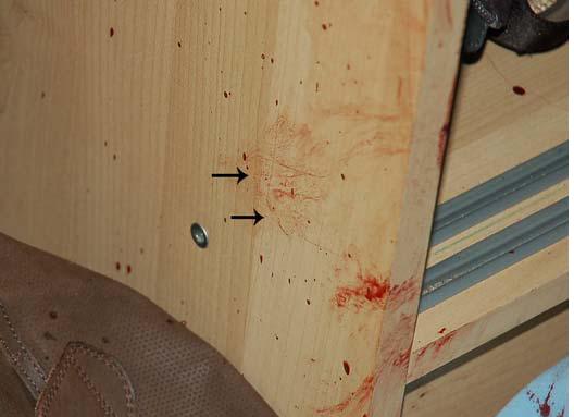 The photo above shows the aspiration blood drops and the hand markings at the arrows were left after Meredith had been moved to her final position on the floor.