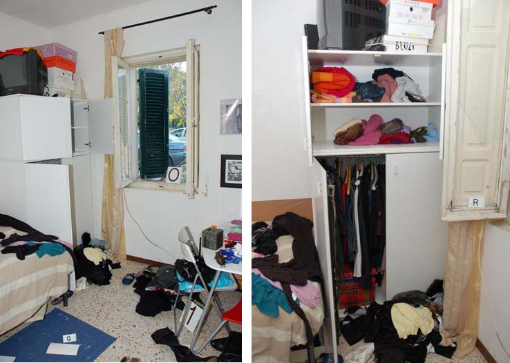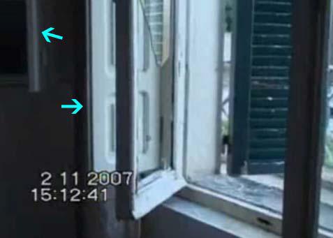 The photo above was taken from an early video of the broken window with the time record saying it was taken about two hours after the discovery of Meredith Kercher’s body. Left arrow locates open wardrobe door. Right arrow locates solid wood shutter.