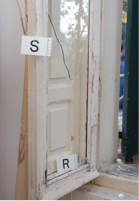 The photo above shows the broken window more clearly such that one can see the almost total lack of dangerous broken shards remaining in the sash grooves.