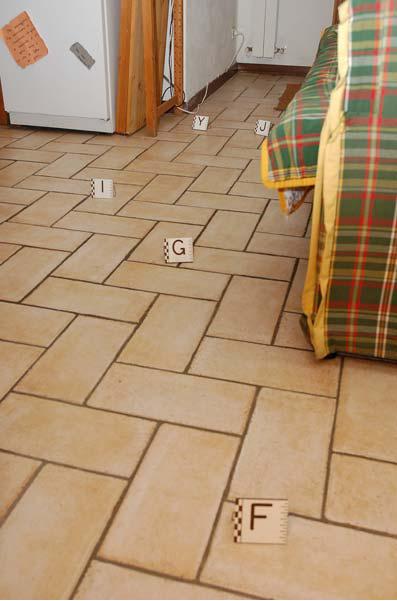6. Bloody imprints of one set of athletic shoes in the hallway, and on the floor and other items in the murdered flatmate’s room, and