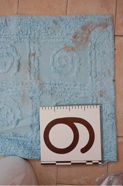7. A bloody imprint of a male sized foot on the bathroom mat.