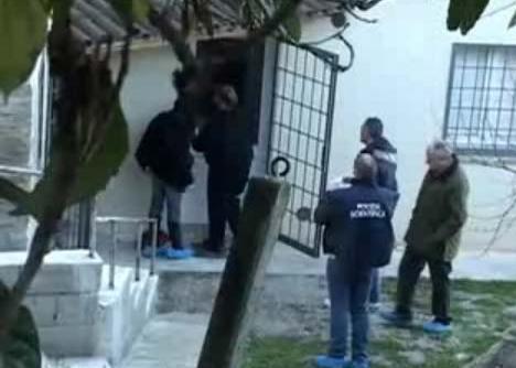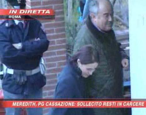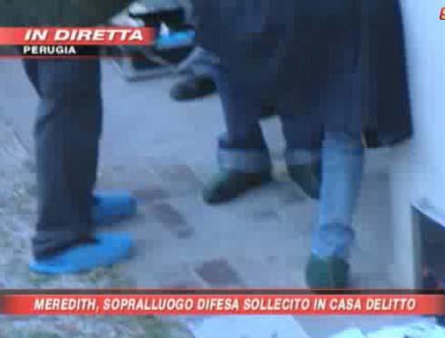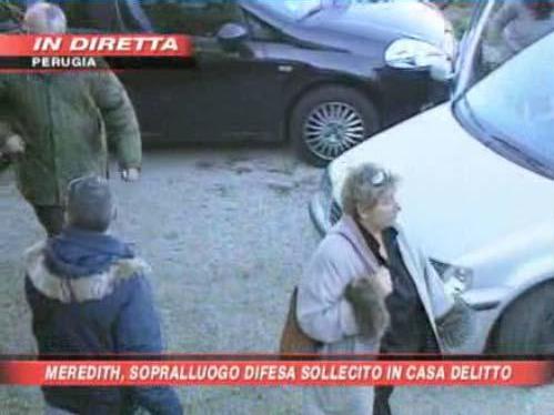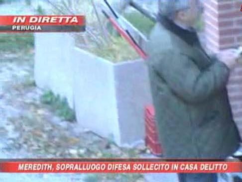 In the photos Mignini is in the green coat and in front of him is a heavyset woman in light coat and large handbag believed to be policewoman Lorena Zugarini. Mignini is greeted by police officials as he passes and heads to the entrance to the cottage. Of special interest is that both Mignini and the woman believed to be Zugarini never break stride once they reach the entrance and don’t stop to put on shoe covers before entering the upstairs cottage flat where the murder occurred.