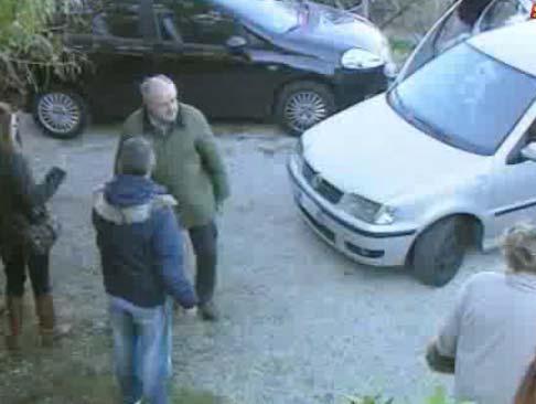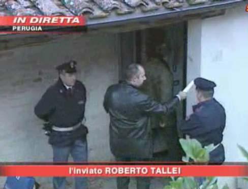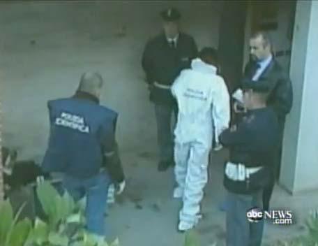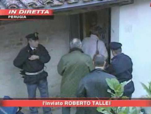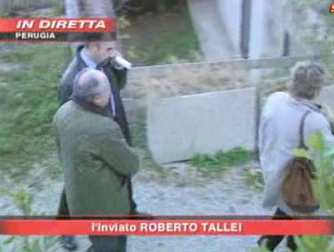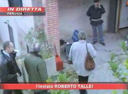 Word of the crime circulated fast and news organizations quickly set up camp on the shoulder of the road overlooking the cottage. Early videos show police officers and officials outside the cottage engaged in cell phone conversations. One of these calls was apparently to lead Prosecutor, Giuliano Mignini, whose initial arrival in the afternoon of November 2, 2007 was captured by news video cameras. The first eight photos shown below are still photos from published videos.