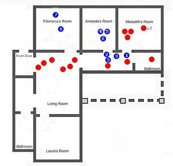 Below, we show the basic layout of the apartment. This picture is not to scale and the footprints are shown in their general locations. The blue dots are stains detected with luminol. The red dots are shoe prints and a footprint that were visible to the human eye and were all made in Meredith's blood.