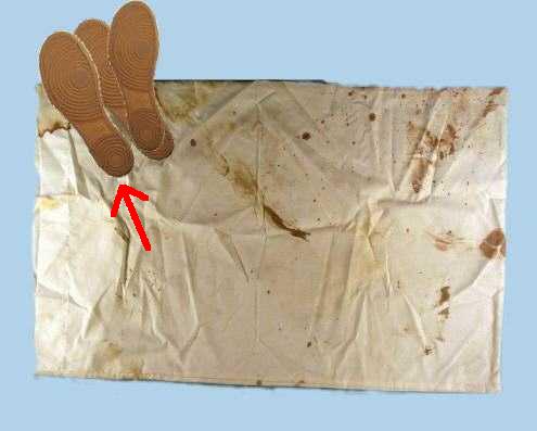 The shoe print below is the print that was said to be a woman's size 37 shoe. This is a left shoe print. Vinci's rubber shoe prints show the tread on both sides. He did this so you can see the tread pattern as it would look on the fabric if the rubber shoe print was not there.