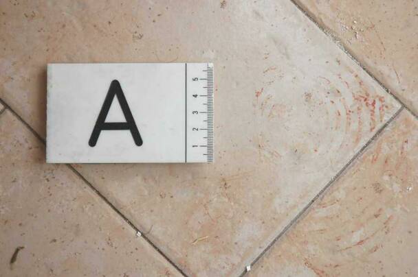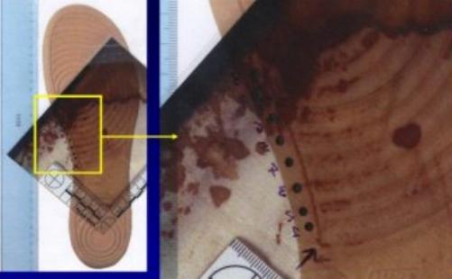 The photograph below shows one of the three shoe prints that were found on the tile floor near the foot of Meredith's bed. Shoe print A was the disputed shoe print.