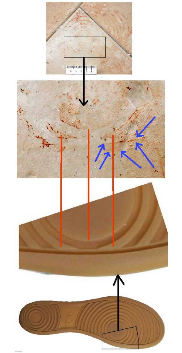 Forensics expert Francesco Vinci showed without a doubt that this partial shoe print matched Rudy Guede's Nike Outbreak 2 shoes. As you can see in the photos below, the tread pattern of the Nike Outbreak 2 matches up perfectly with the stain.