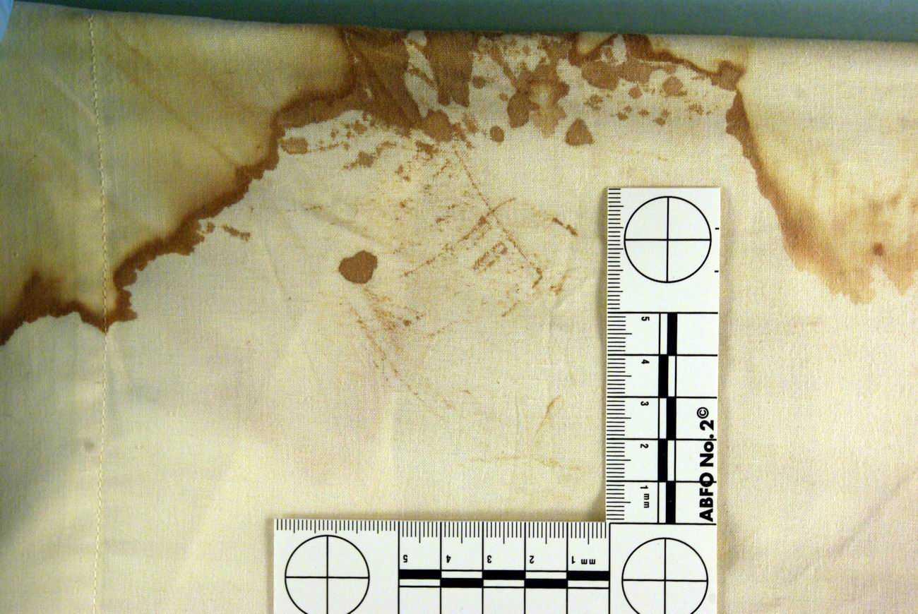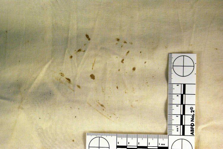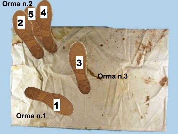 Forensics expert Francesco Vinci identified all five by highlighting the fabric using a process called Crimescope. None of these shoe prints represent a woman's shoe size 37 as stated by the prosecution. The prosecution's expert only found one partial shoe print on the edge of the pillowcase. It was that shoe print that was said to be a woman's shoe. The truth is, there were three partial shoe prints. All three partial shoe prints match the tread pattern on Rudy Guede's shoes. Both the prosecution and defense agree that four of the shoe prints on the pillowcase belong to Rudy Guede. Shoe print number 2, as seen below, is the disputed shoe print. This shoe print was discussed here.