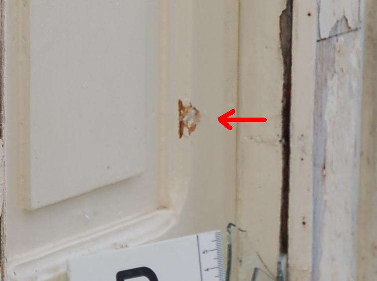 The next two photographs show where the rock hit the inside shutter. You can clearly see the damage caused by the rock on the wood shutter.