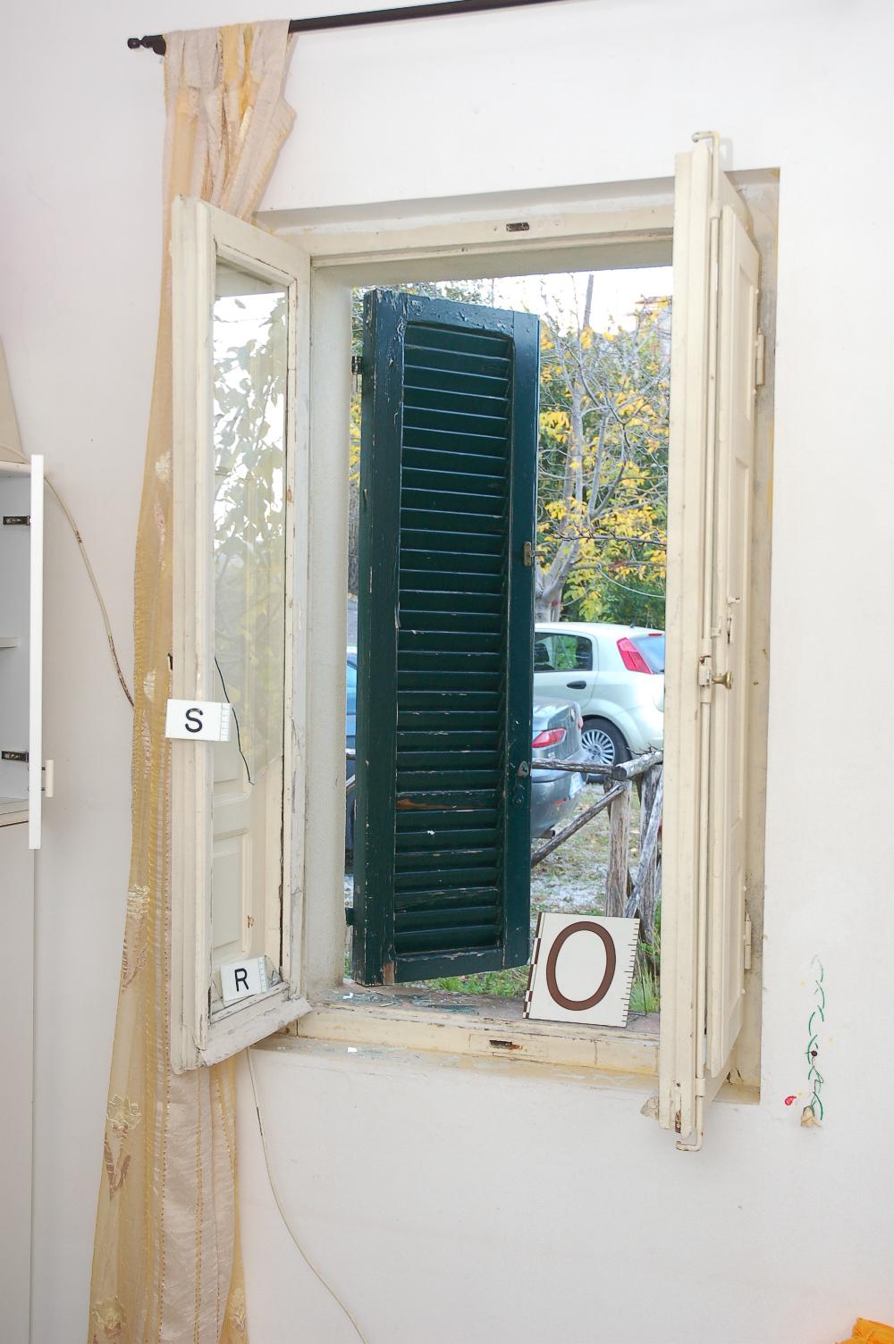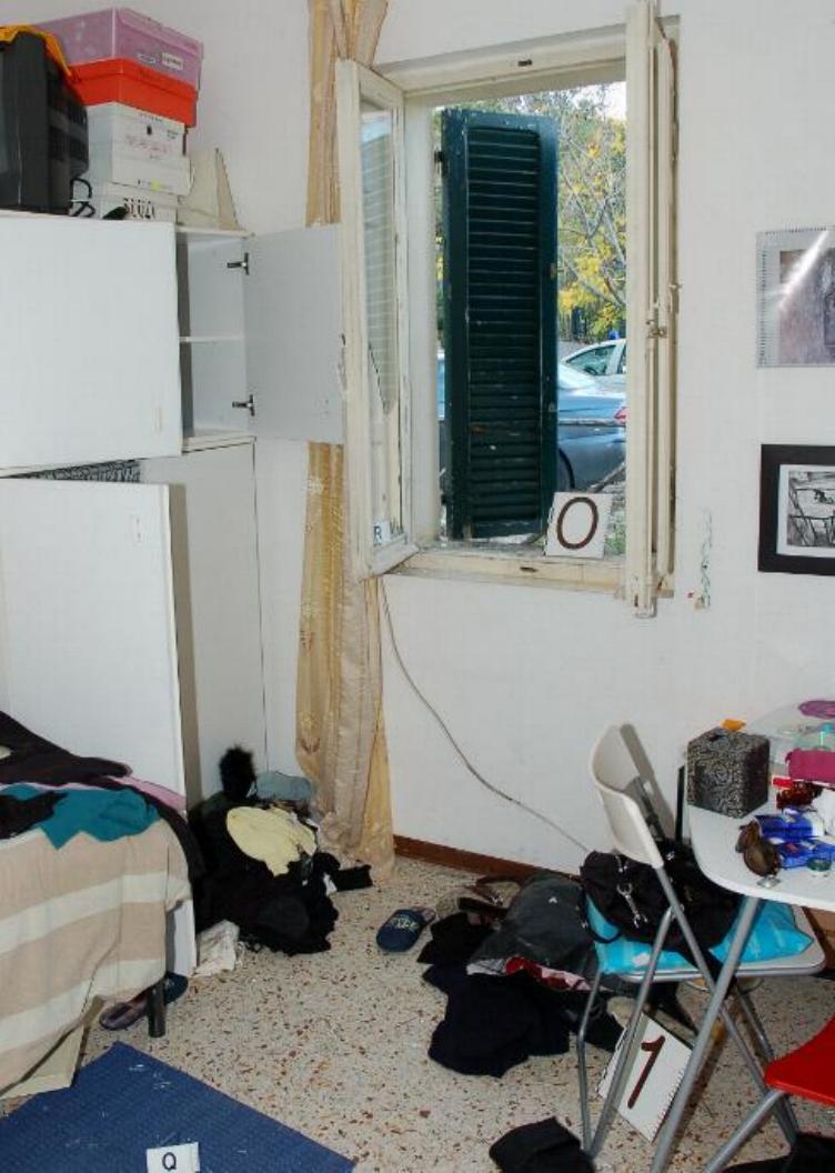 The prosecution alleged that the break in was staged and that no one actually climbed through the window to gain entry to the cottage. They stated that the room was ransacked to make it look like a burglary and that the rock was thrown from inside the cottage to break the window. Proper analysis of the crime scene photographs shows a completely different scenario. The photographs below show that the rock was thrown from outside the cottage. There is absolutely no evidence that the break in was staged. There was no investigation done on the room to conclude that the break in was staged. The room shown below belonged to Filomena. She is one of the four women that lived in the cottage. Filomena went into her room several times on November 2nd, before the discovery of Meredith's body. She told the police that she saw glass on top of her clothing from the broken window. There are no photographs showing any glass sitting on top of any pieces of clothing.