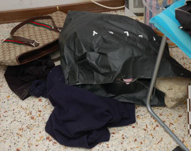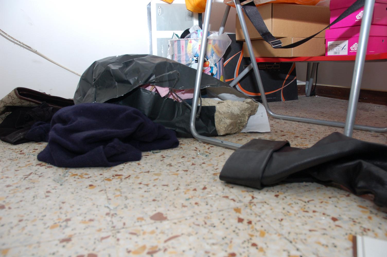 The next two photographs show the rock where it came to rest on the floor. The rock caught the edge of the black bag tearing the paper as it knocked the bag over.