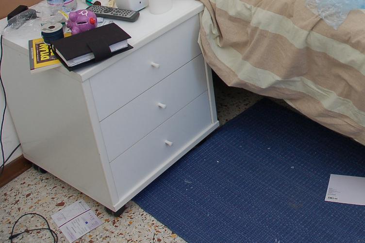 The next four photos show how far the glass came into the room. This never would have happened if the rock was thrown from inside the room. These photos also show, once again, that Filomena's room was not ransacked as the prosecution stated. This is a very important point. The prosecution stated that the room was ransacked by Amanda and Raffaele to stage a break in. Let's analyze this a little bit closer. Take a look at the table and chair. You will see that the table is covered in clutter. There are at least two more items sitting on the chair. These items have not been thrown about on the table. Filomena simply left everything laying around. The same goes for her nightstand. Keep in mind, Rudy could have thrown some items around looking for money. This would account for paper on the floor and the messy bed. Filomena also went through her room in a hurry the morning after the murder. There are no signs of staging. Filomena's room was a mess to begin with. These photographs prove this without a doubt.