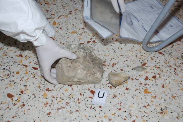 The next photograph is very important. You can see that the rock tore the bag open as it fell to the ground. More importantly, you can see dust from the rock on the floor as well as small pieces of the rock that broke free from the impact with the tile floor.